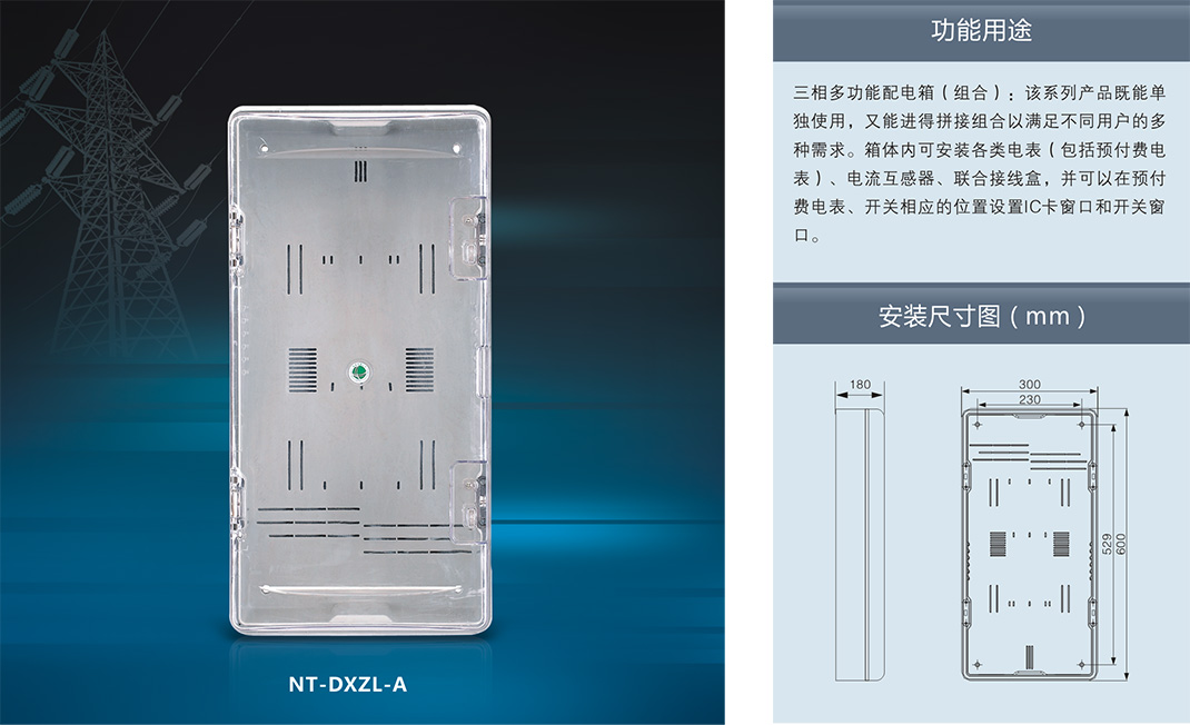 ,采用進口聚碳酸酯(PC)和阻燃ABS工程塑料制成。具有抗沖擊、抗老化、耐腐蝕、透明度高、抗紫外線、安裝方便等優(yōu)點,并且具有用電安全保護,用戶分離控制,數據采集, 防盜電等功能。產品適合安裝電子式、機械式、智能IC卡預付式、智能多費率式電表。南騰NT系列透明