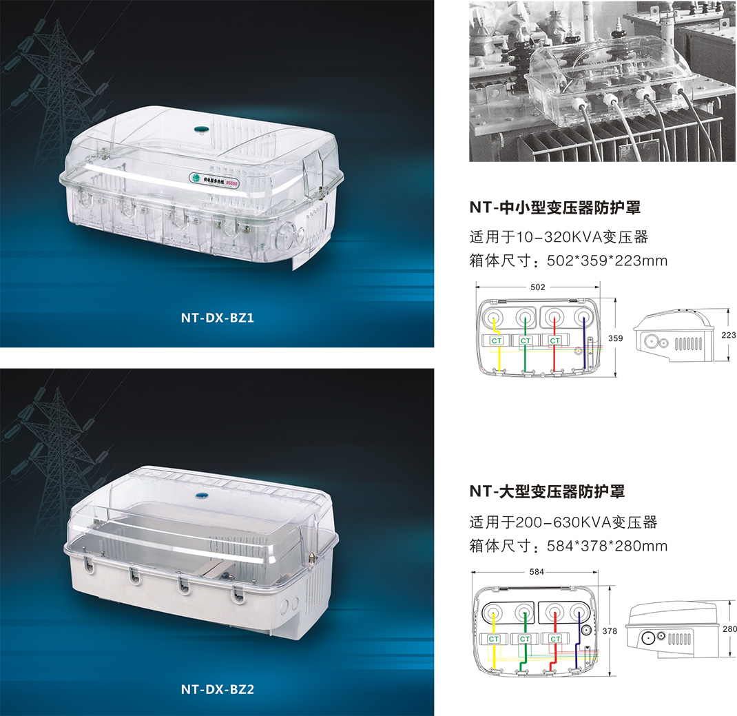 NT-DX-BZ系列防竊電變壓器防護罩箱體材料采用進口聚碳酸酯(PC)和阻燃ABS工程塑料制成。對配電變壓器低壓出線側實施全封閉保護。在不打開保護罩的前提下,異物無法觸及低壓出線接線柱,從而有效防止竊電行為發生。保護罩內預留互感器安裝位、二次回路出線孔及電纜固定夾,可配合多功能計量配電箱使用,實現電表箱與電流互感器分開安裝,實現“線進管、管進箱、箱加鎖”的全封閉防竊電目標。